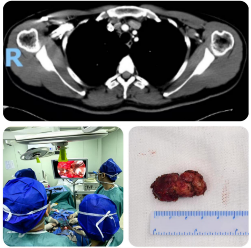 患者为36岁青年男性,术前甲状腺彩超提示:甲状腺右叶结节为2.2x1.5x1.2cm(TI-RADS 5类),增强CT提示:右侧颈部、气管前方、纵隔内多发肿大淋巴结,FNA示:(右叶)甲状腺髓样癌,(气管周围淋巴结)查见癌细胞,(右颈部淋巴结)查见癌细胞。在传统治疗方案中,上纵隔淋巴结清扫多需联合开胸或胸腔镜手术,不仅手术创伤大、术后恢复时间长,还可能引发肺部感染、胸廓畸形等并发症,给患者带来额外负担。面对这一治疗难题,盛蕾副主任医师充分评估患者病情,与曾庆东教授、吕斌教授反复研讨手术方案后,决定突破传统入路限制,创新性采用经颈部切口入路腔镜辅助上纵隔淋巴结清扫术。
