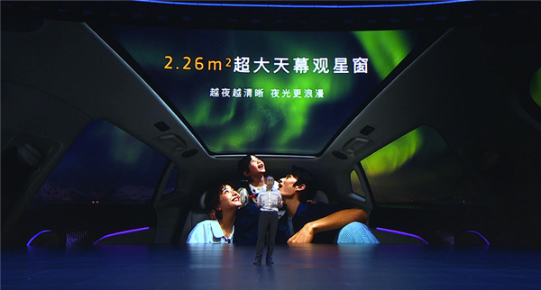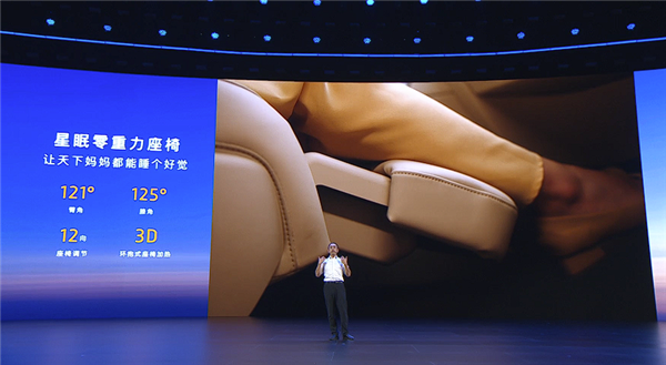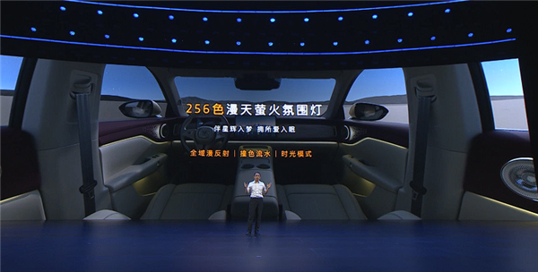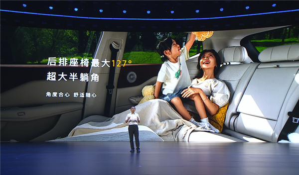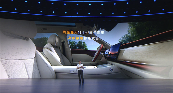 配置方面,车内软包面积达到16.4平方米,同级最大,还拥有前排双50W无线风冷充电面板、双开门智能冷暖箱、副驾驶零重力座椅、2.26平米带电动遮阳帘的全景天幕、256色氛围灯以及高达127°的后配座椅靠背调节。