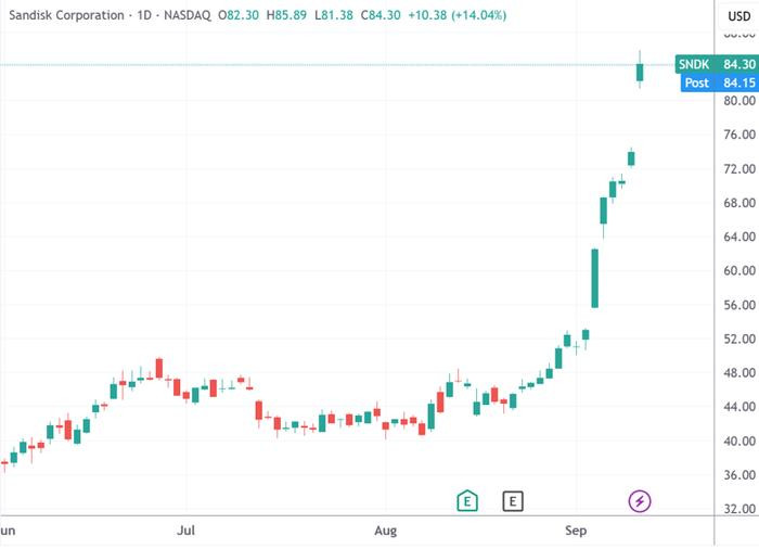 财联社9月12日讯(编辑史正丞)截至美股周四收盘,美国内存芯片公司美光科技大涨7.55%,闪存巨头闪迪(Sandisk)拉出一根14%的阳线,两家公司均走出七连阳的暴力拉升节奏。
